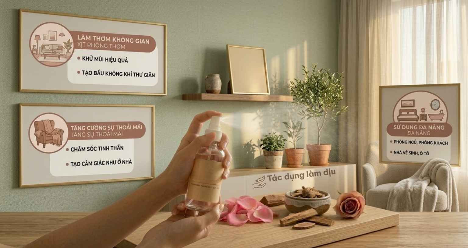 Nước hoa phòng không chỉ giúp tạo mùi hương dễ chịu mà còn góp phần cải thiện trải nghiệm không gian sống và làm việc. Sản phẩm thường được sử dụng để khử mùi trong phòng, giảm các mùi khó chịu như mùi ẩm mốc, mùi thức ăn hoặc mùi nội thất.